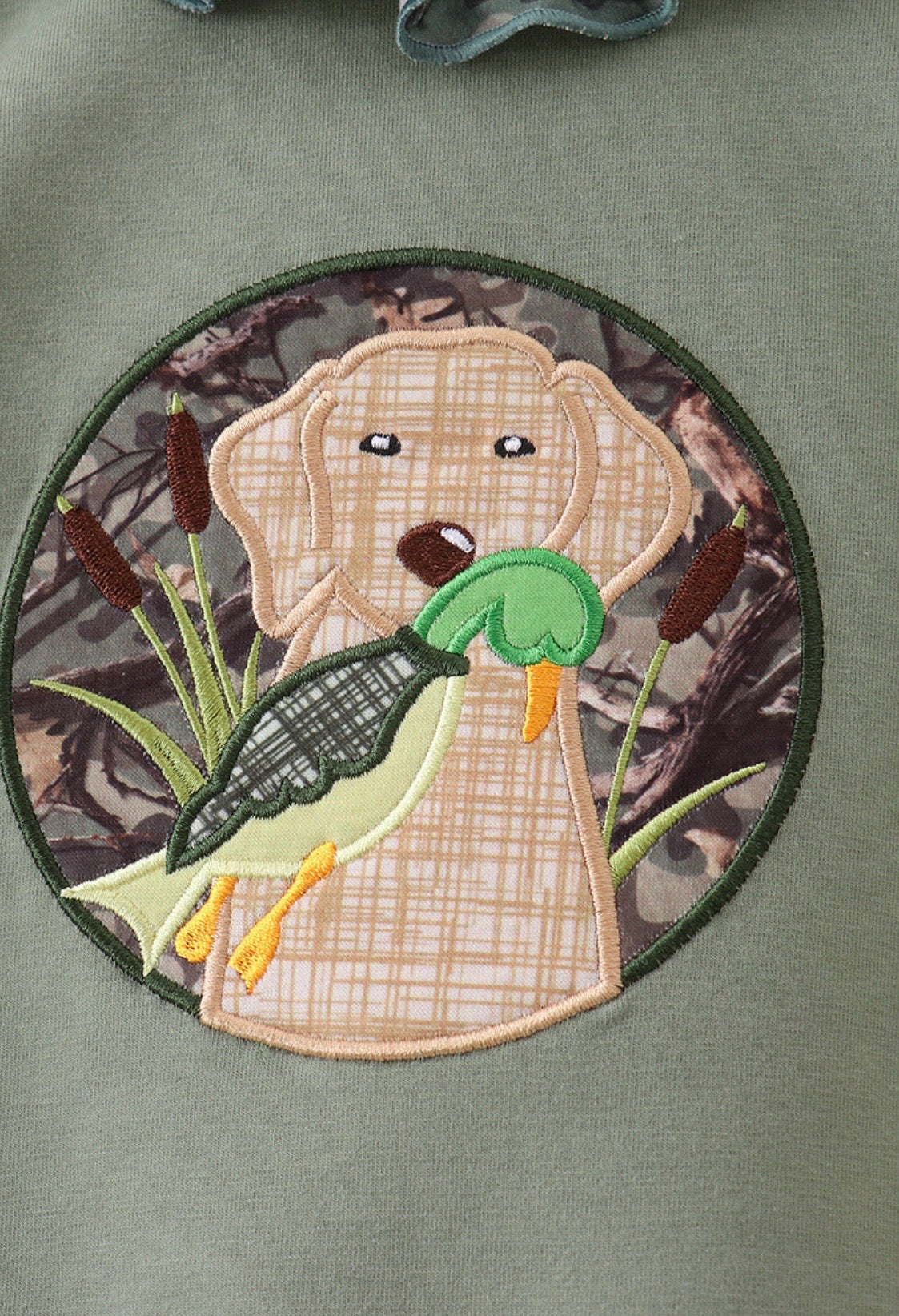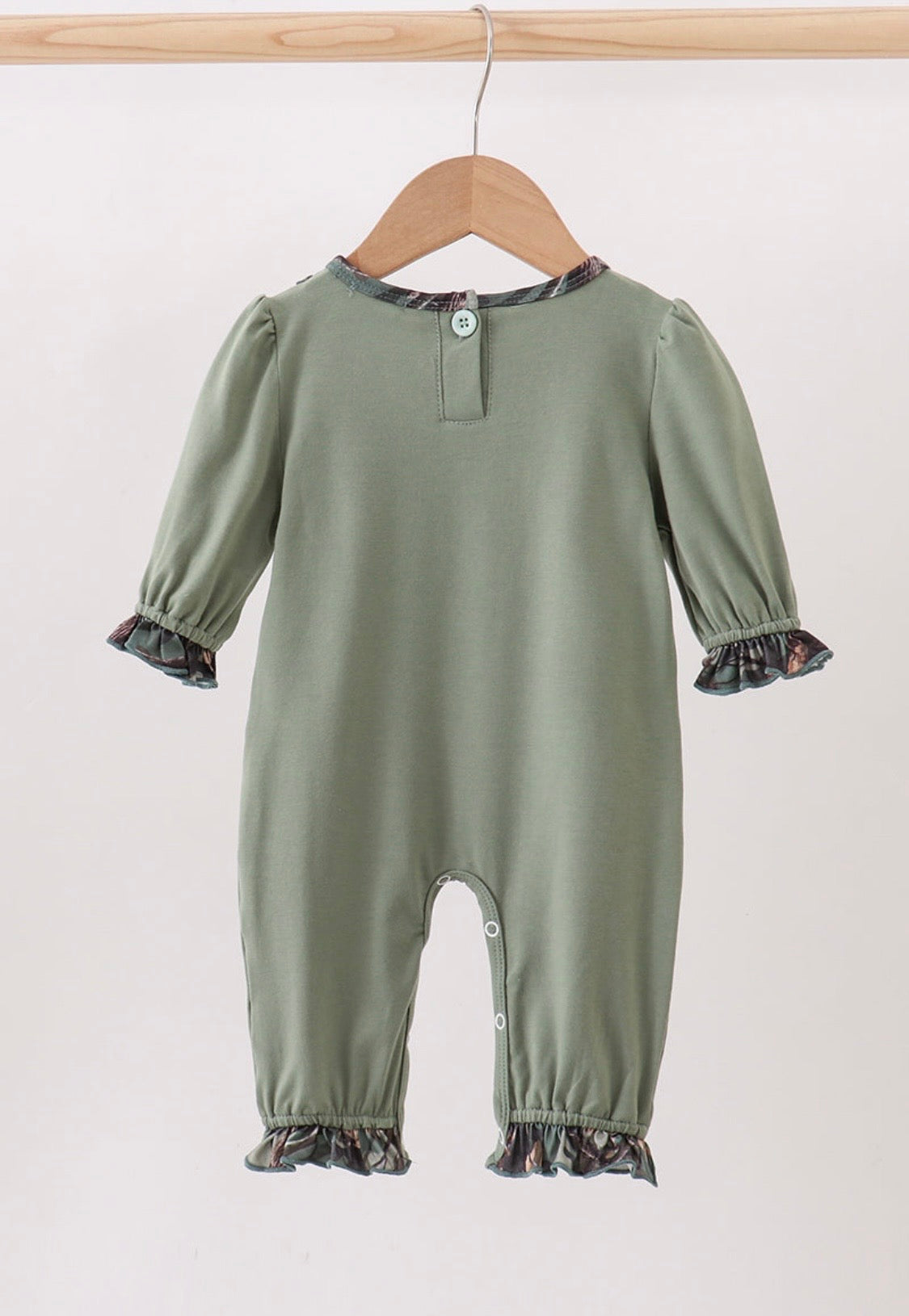 This playful romper features a charming camouflage print with a cute dog hunting applique, perfect for your little adventurer. The ruffle details add a fun, flirty touch, making it ideal for outdoor play or casual days. Comfortable and stylish, it’s ready for any little explorer’s next adventure!