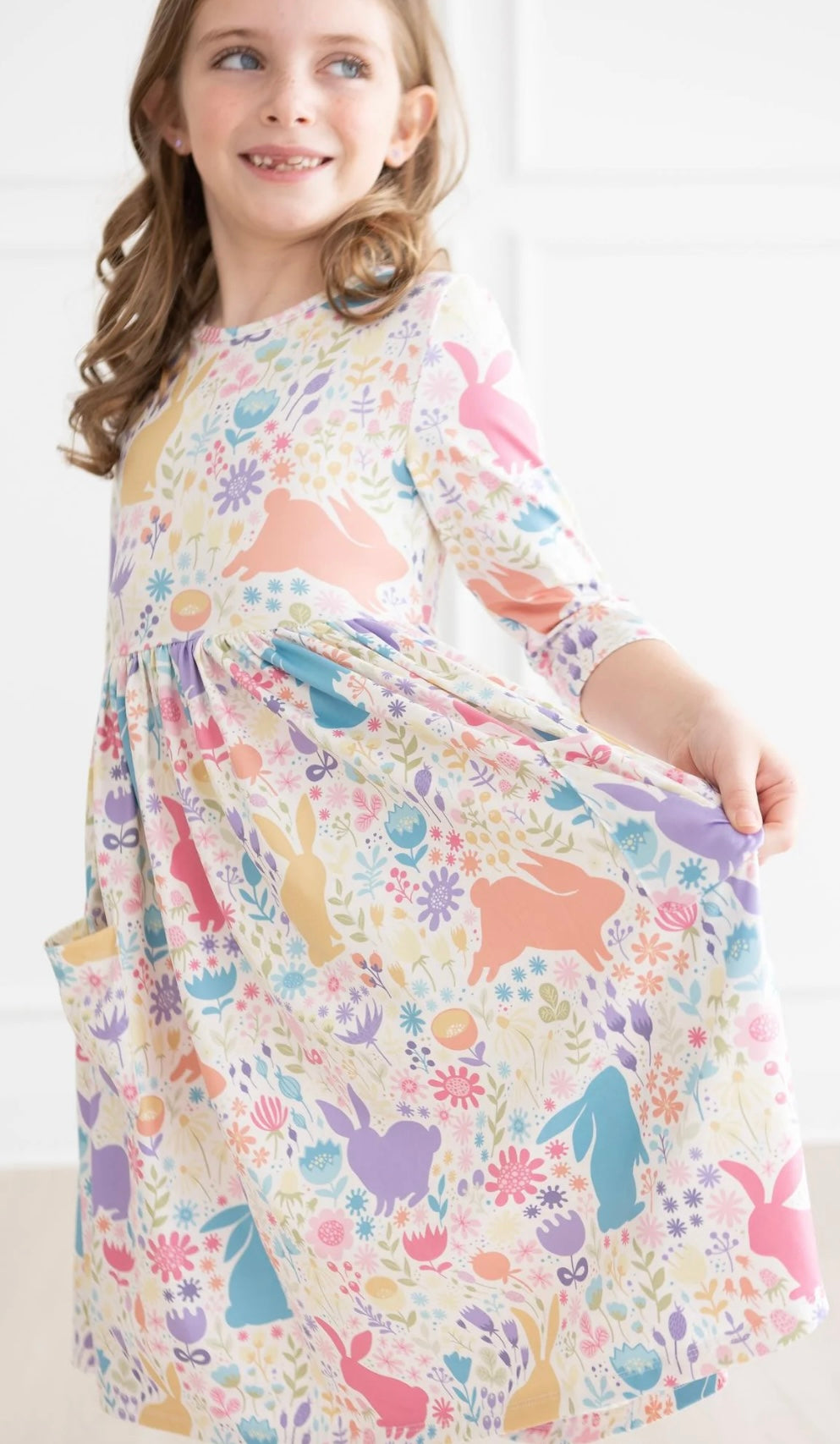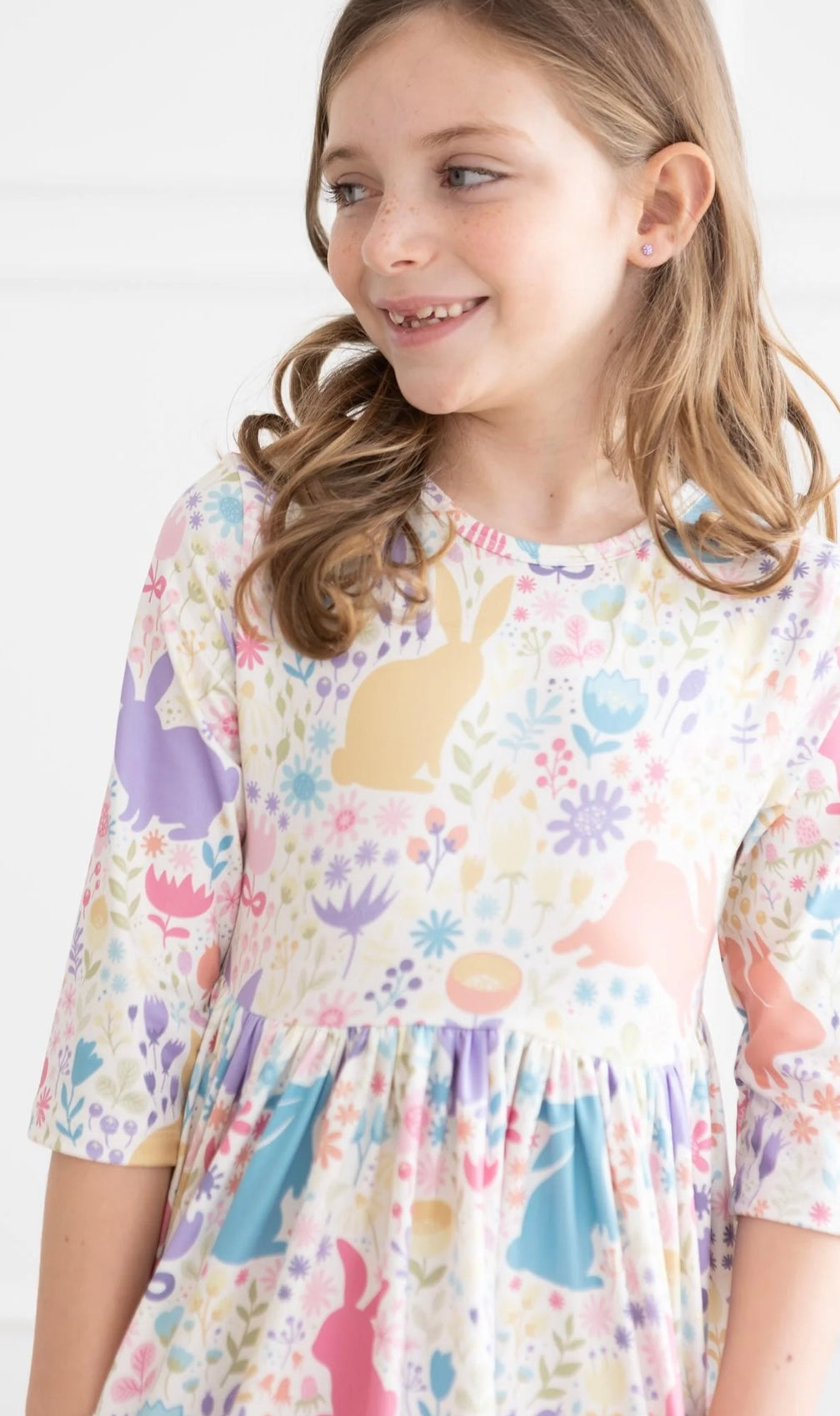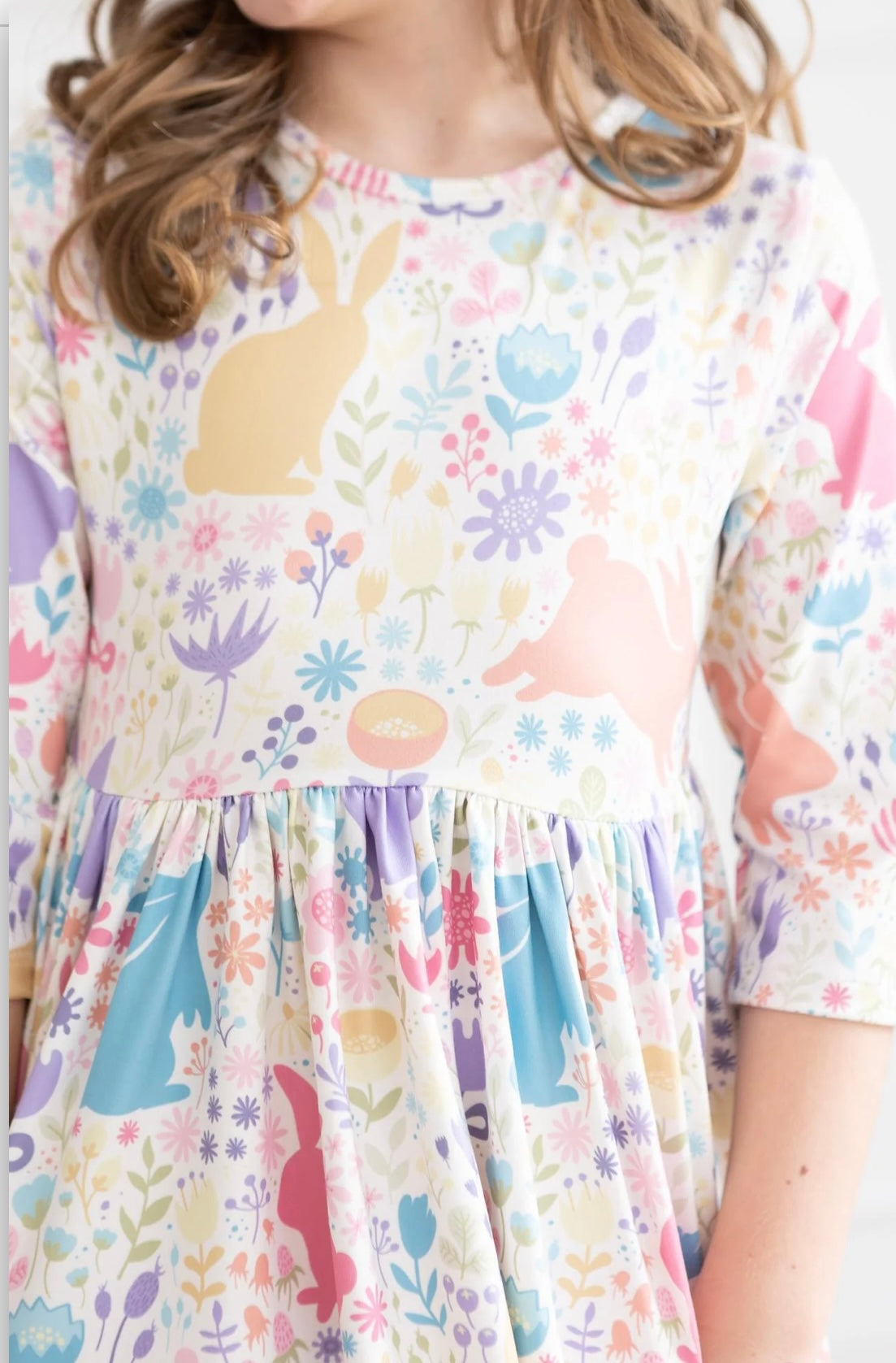 PASTEL FLORAL BUNNIES 3/4 SLEEVE POCKET TWIRL DRESS