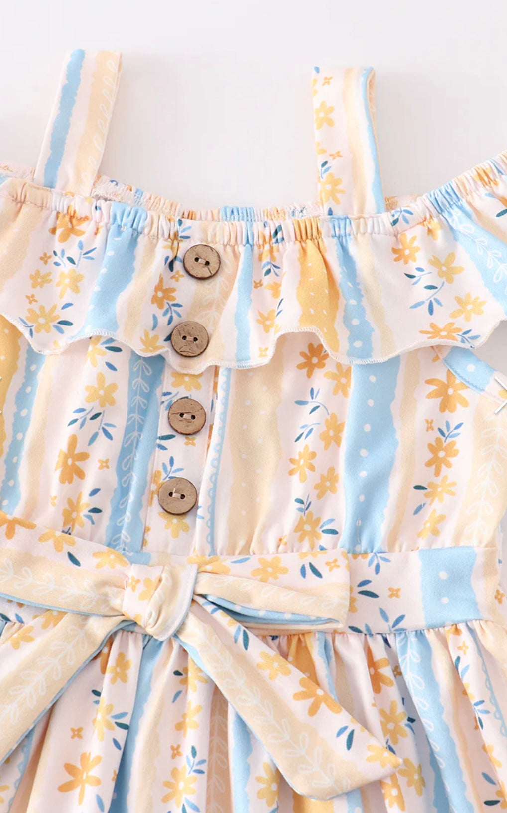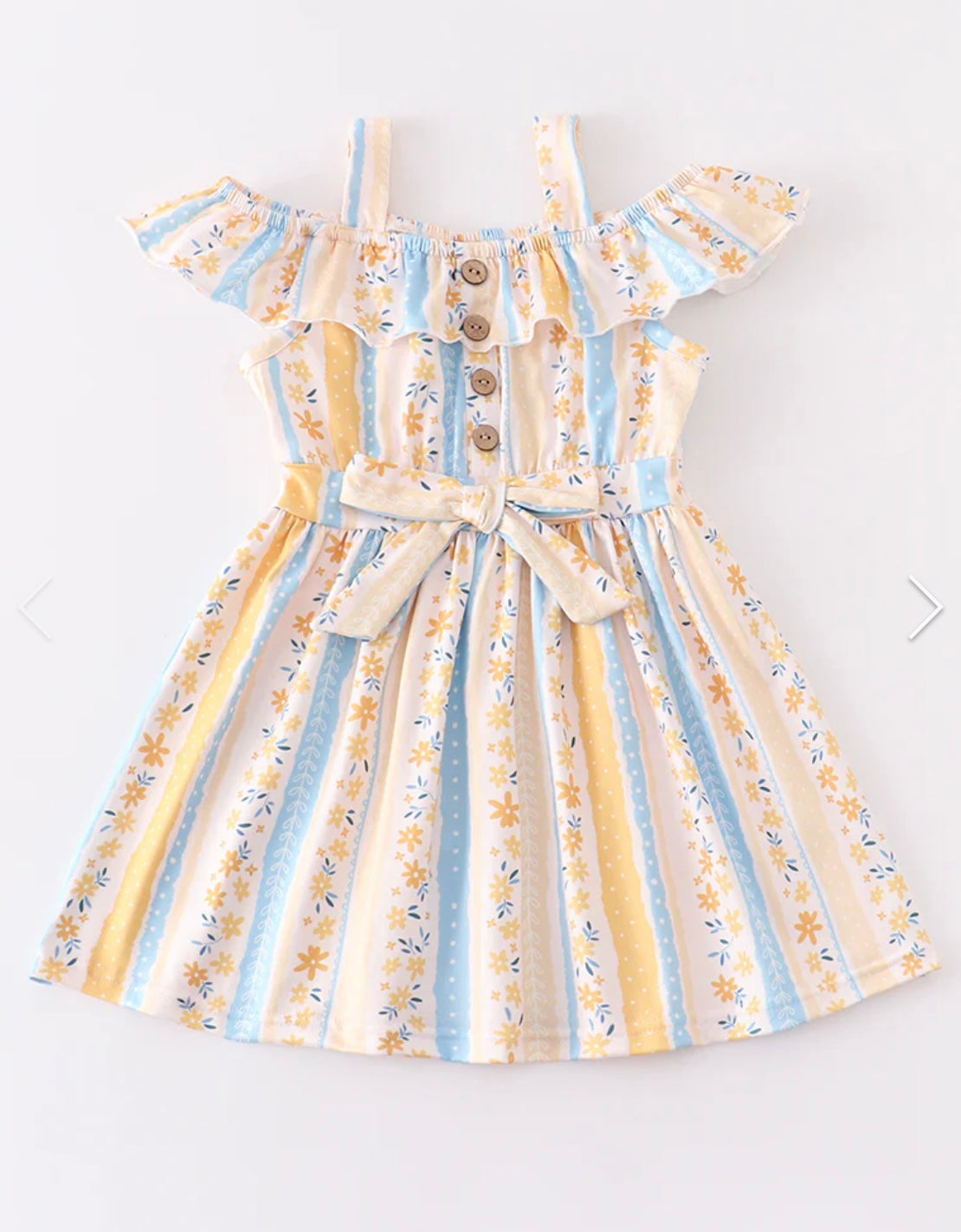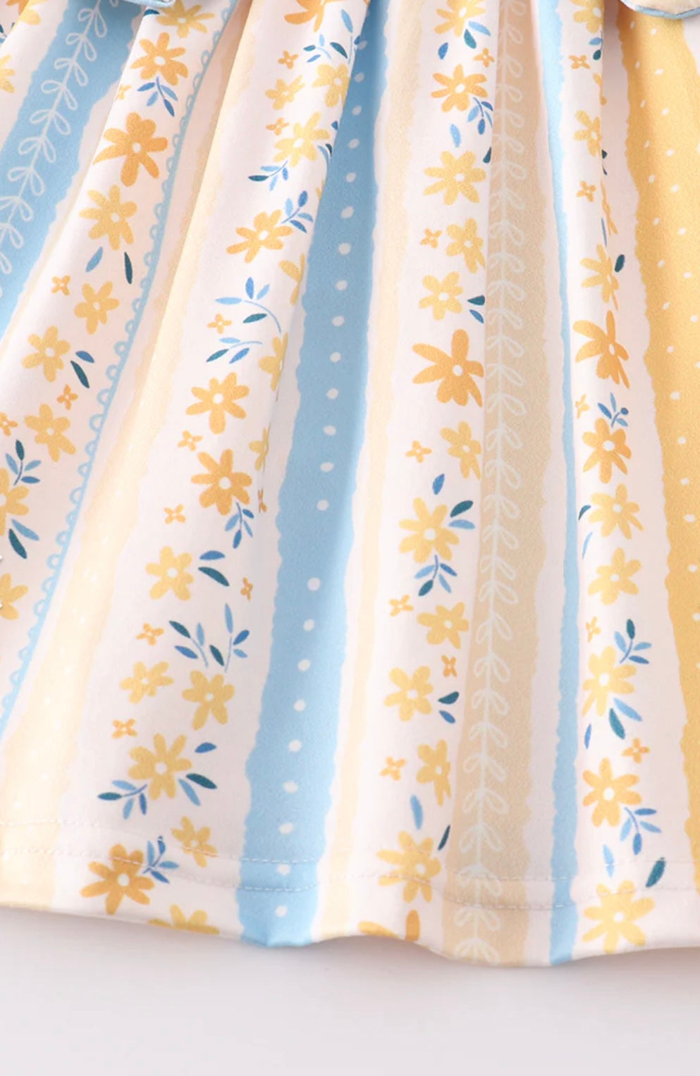 This dress features stripes and floral prints. It is a fun addition to your little girl's wardrobe.